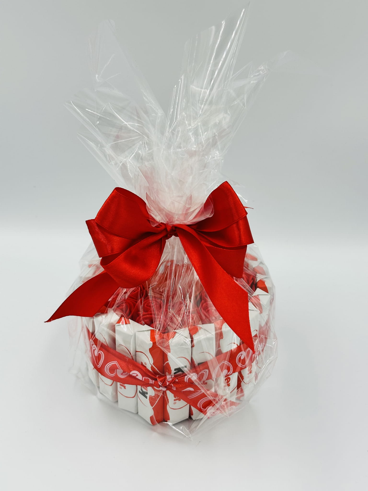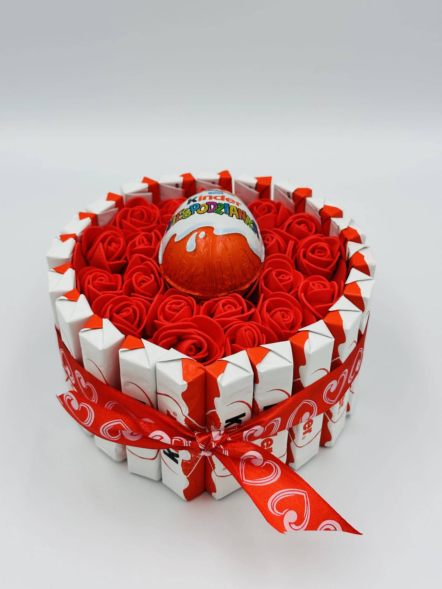 Wyjątkowy tort ze słodyczy Kinder o średnicy 15 cm z różanym wykończeniem - idealny słodki prezent na urodziny i imieniny. Elegancko zapakowany, gotowy do wręczenia bliskiej osobie.