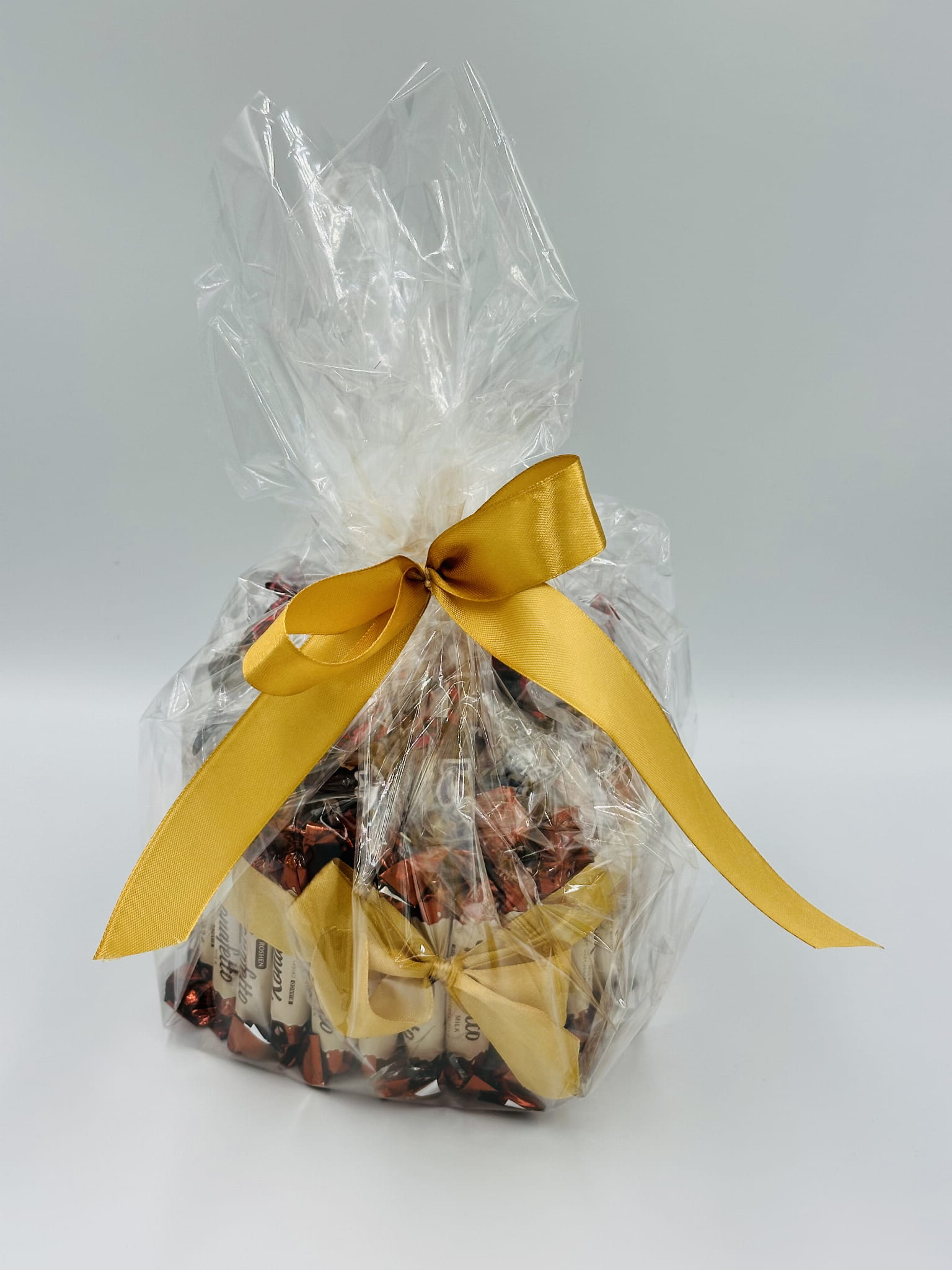 Torcik zapakowany jest w prezentowy celafon z kokardą, gotowy do wręczenia jako prezent.