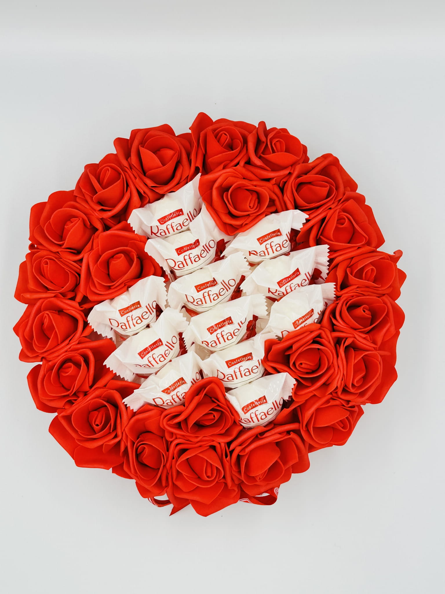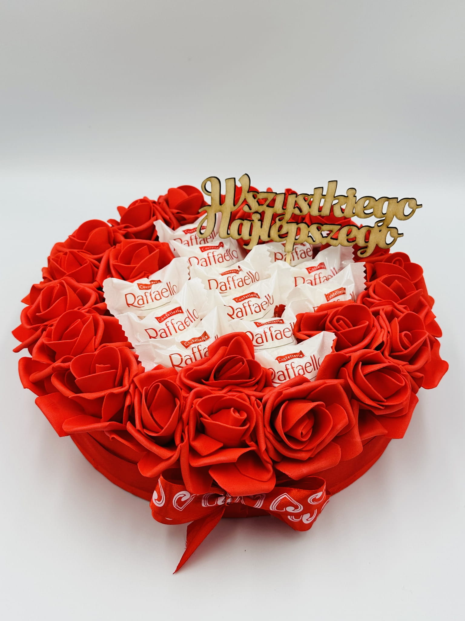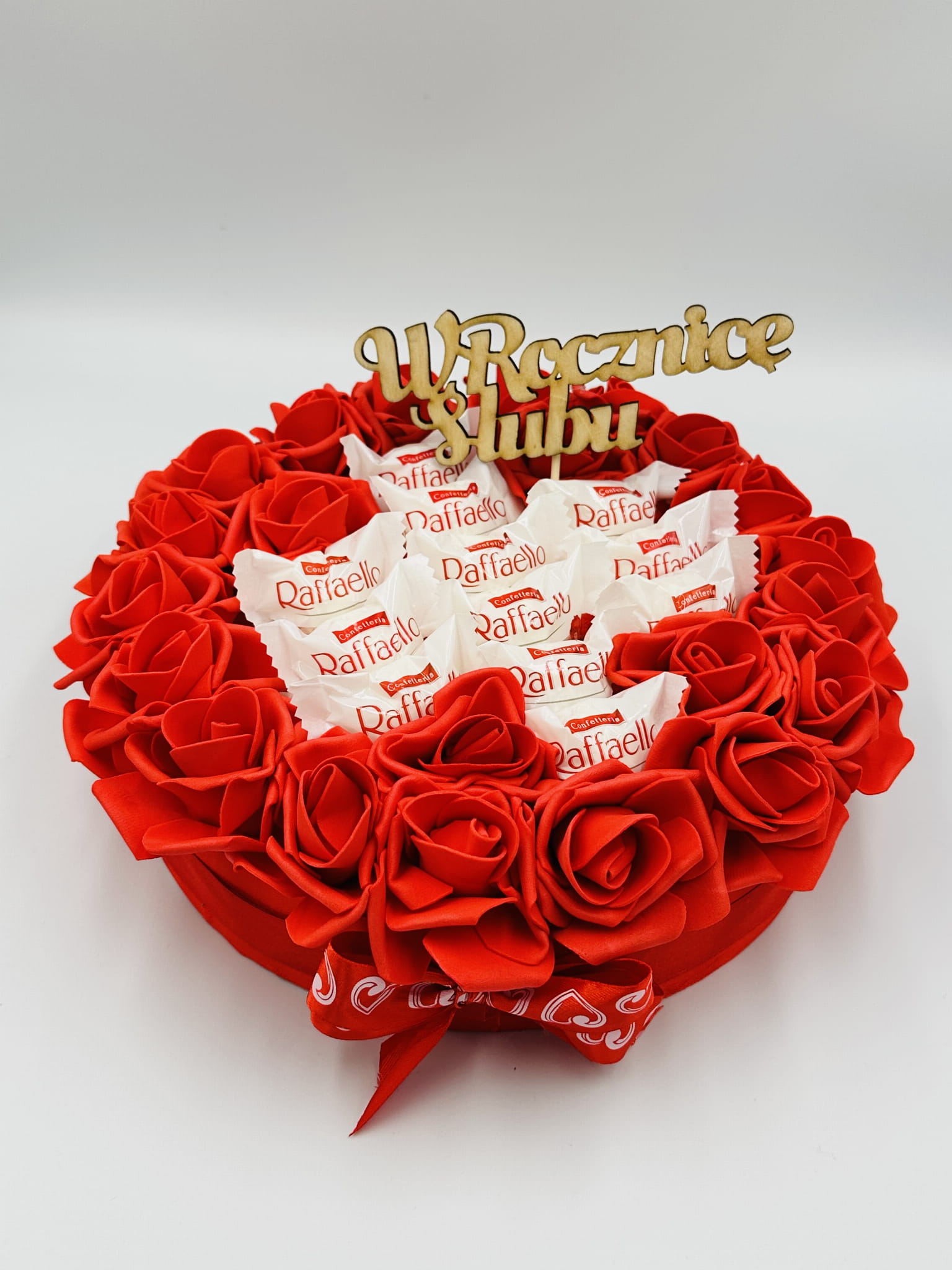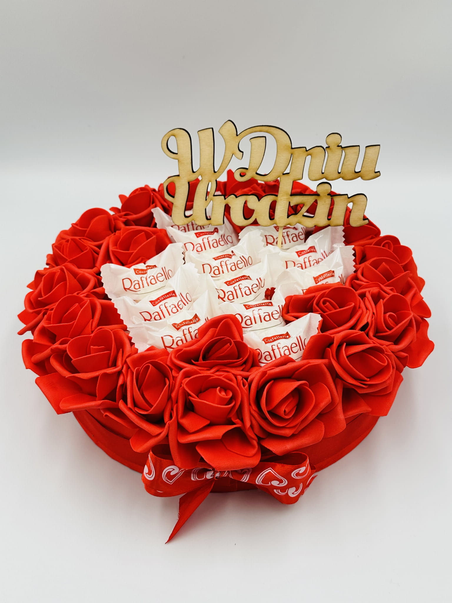 Tort ze słodyczy Rafaello różany na urodziny rocznice 27 cm