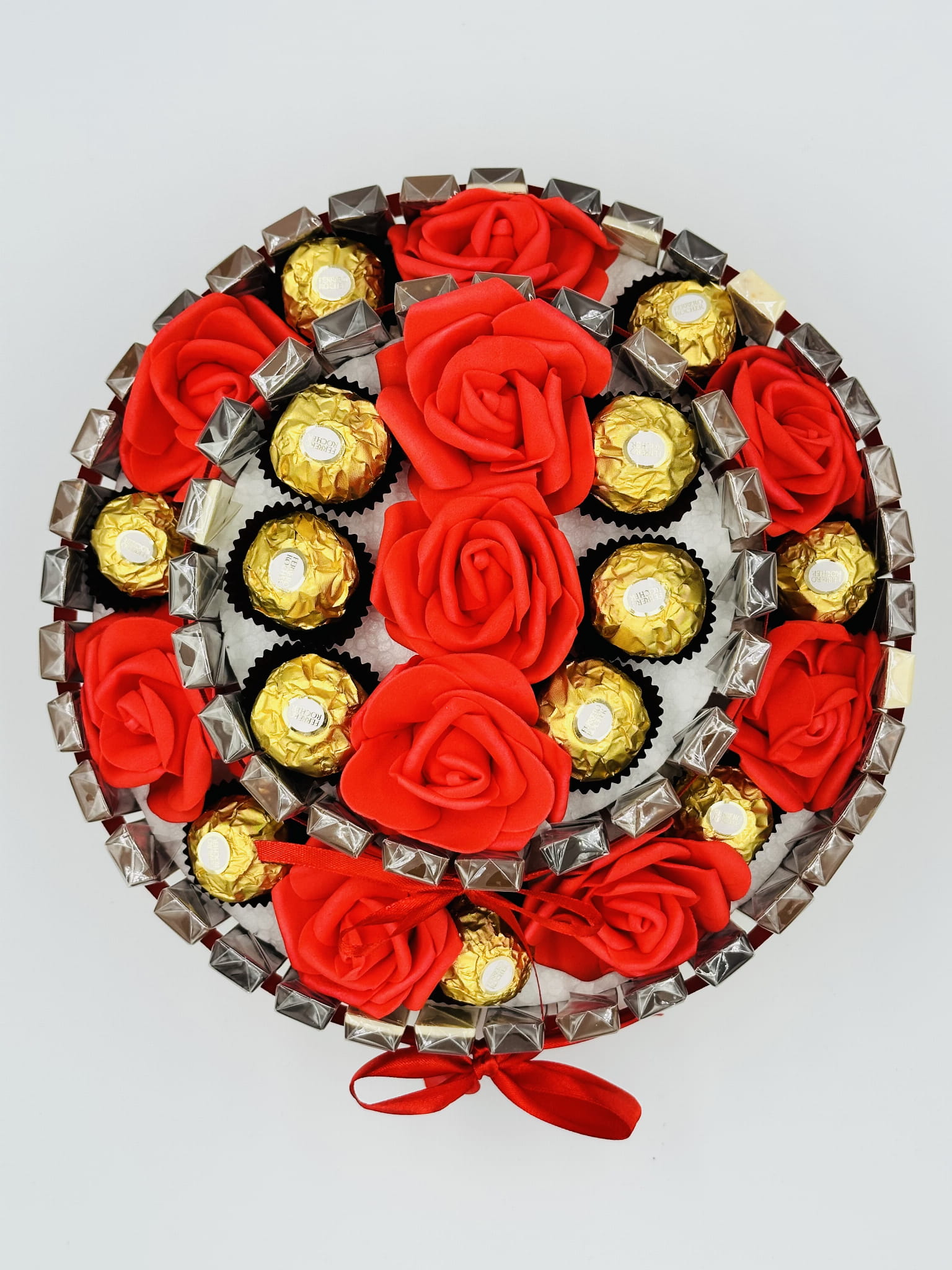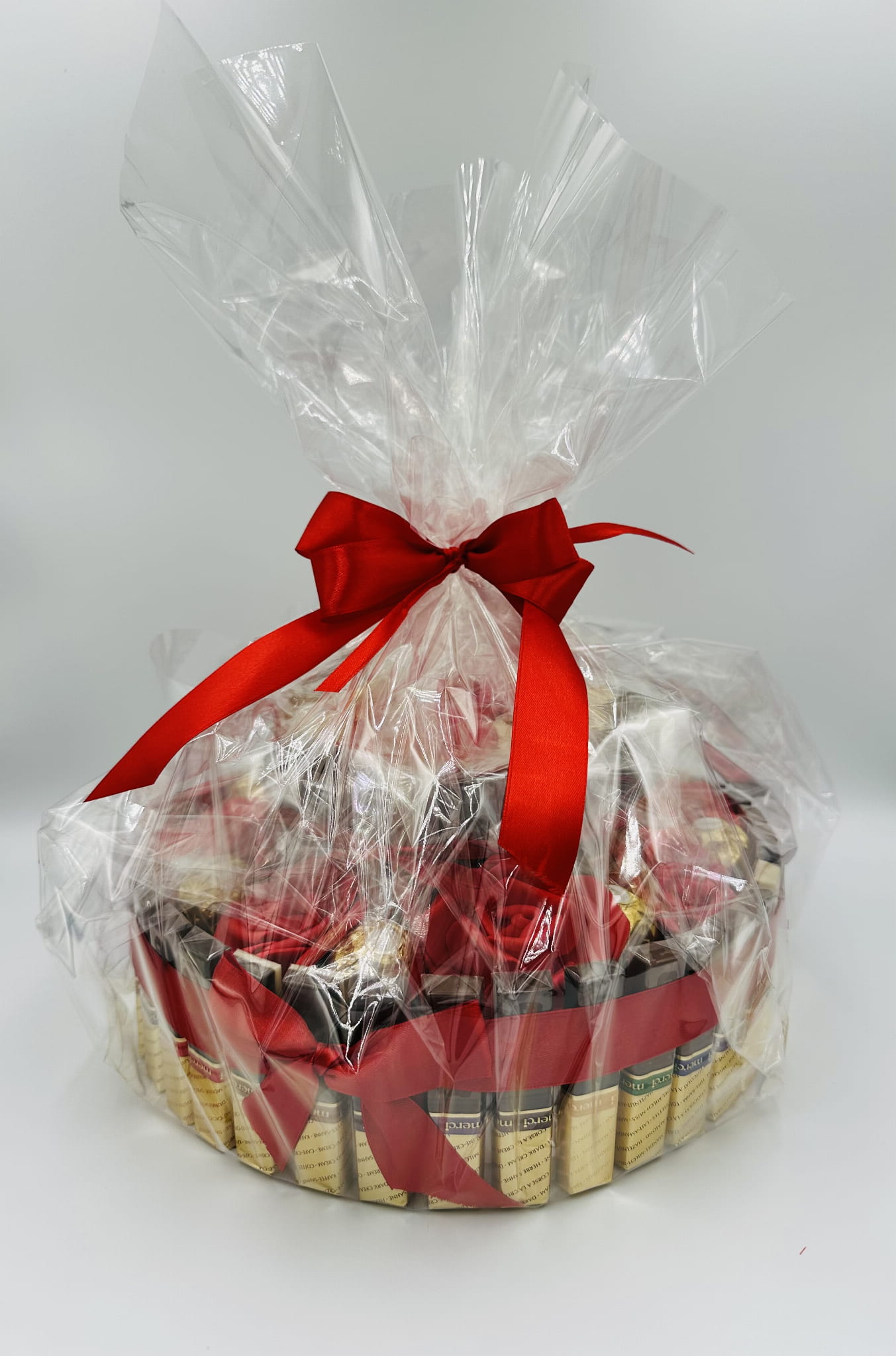 Dwupoziomowa konstrukcja oraz starannie ułożone czekoladki Merci nadają tortowi luksusowego charakteru. To doskonała alternatywa dla tradycyjnych kwiatów lub klasycznych słodyczy – prezent, który wyróżnia się estetyką i uniwersalnością.