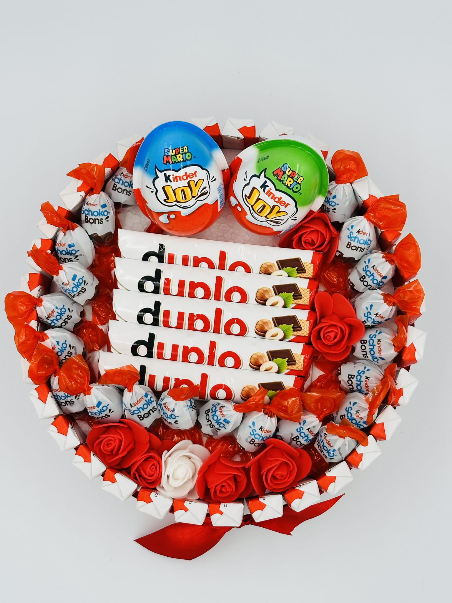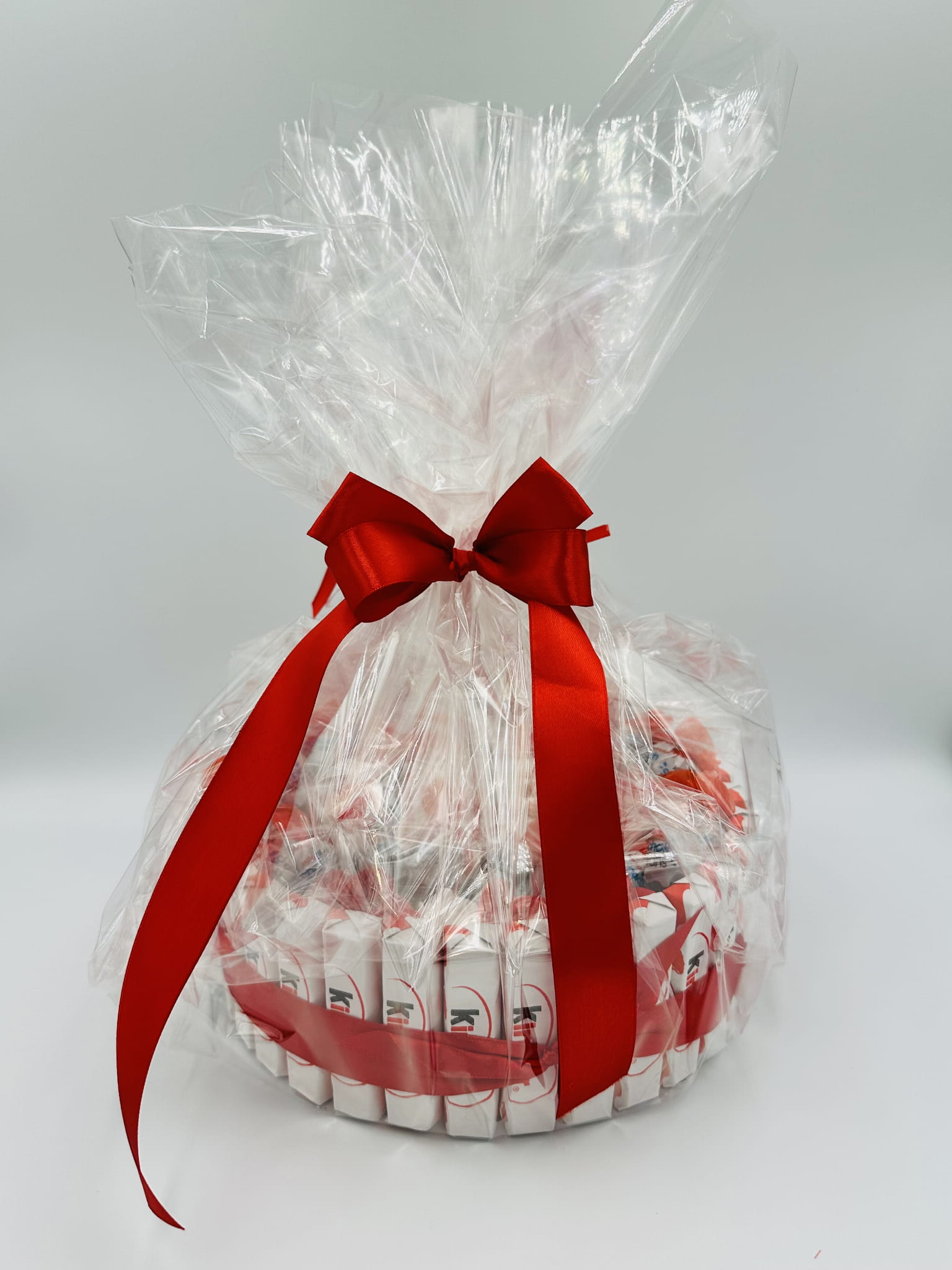 Kolorowy tort ze słodyczy Kinder w wersji jednopoziomowej to idealny pomysł na słodki prezent dla dzieci i dorosłych. Starannie ułożone słodycze Kinder, estetyczna forma oraz kompaktowy rozmiar (21,5 cm) sprawiają, że tort jest gotowy do wręczenia i doskonale sprawdzi się na urodziny, Dzień Dziecka lub inną radosną okazję.