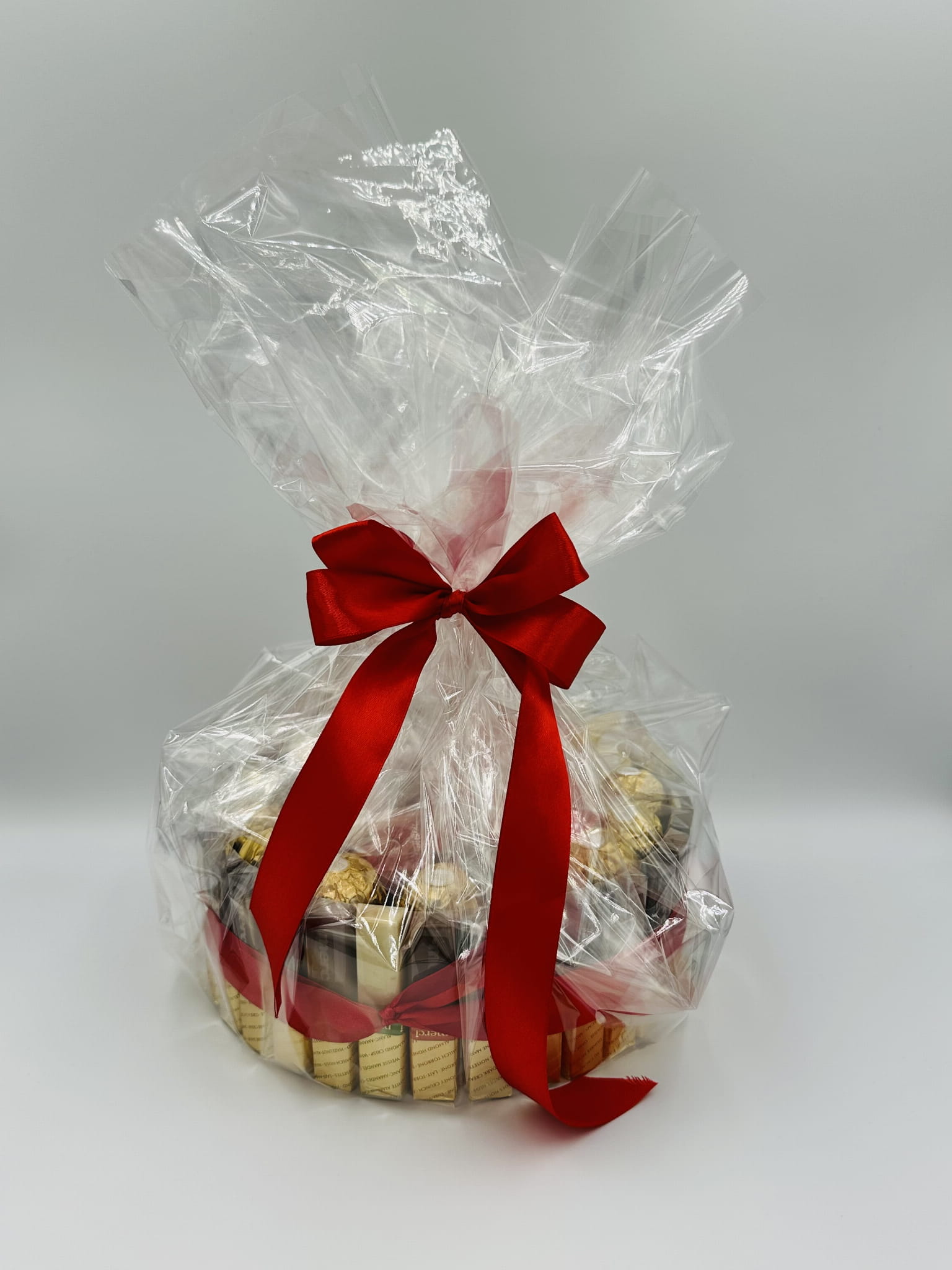 Torcik zapakowany jest w celofan z kokardką, gotowy do wręczenia jako prezent.