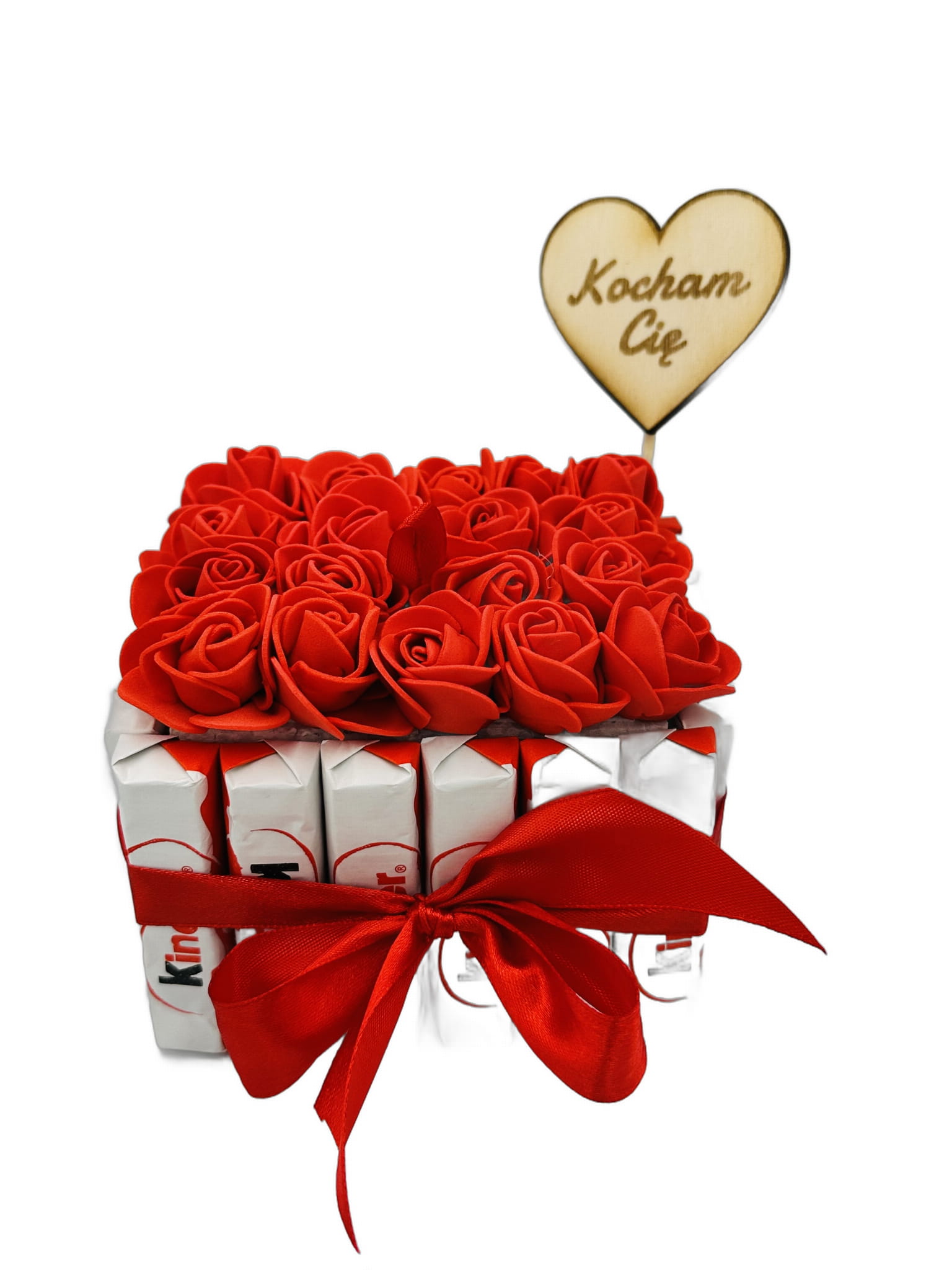 Tort ze słodyczy kosz prezentowy Kinder róże prezent na dzień babci dziadka