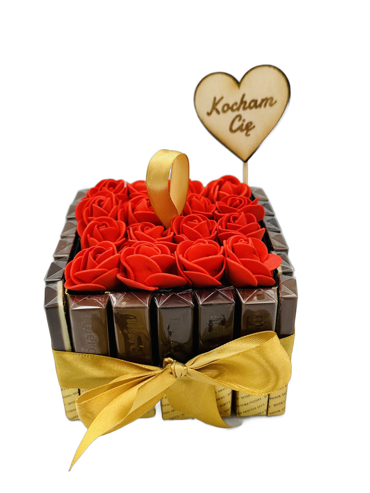 Tort ze słodyczy kosz prezentowy Merci róże prezent na dzień babci dziadka