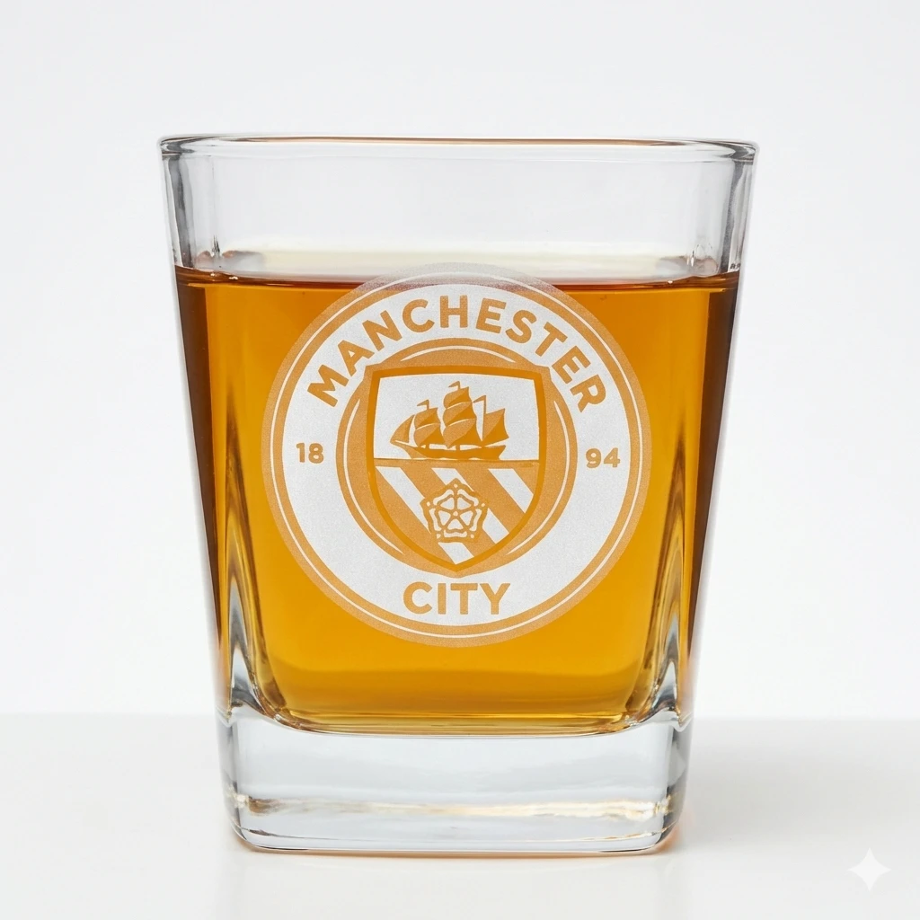 Stylowa szklanka do whisky z precyzyjnym grawerem inspirowana Manchester City - idealny gadżet i prezent dla każdego kibica The Citizens. Wysokiej jakości szkło z klubowym motywem podkreśli każdy wieczór z ulubionym trunkiem i piłkarskimi emocjami.