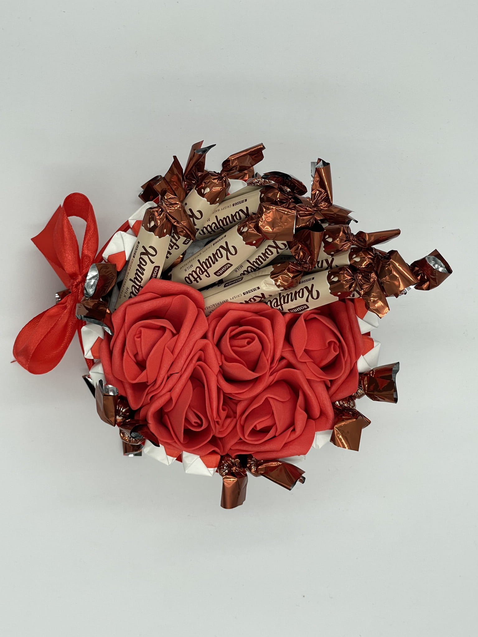 Ten efektowny tort ze słodyczy w kształcie serca łączy popularne słodycze Kinder i Konafetto w wyjątkową kompozycję, która zachwyca zarówno wyglądem, jak i smakiem. To doskonały prezent na urodziny, rocznicę, walentynki lub inną ważną okazję - elegancko zapakowany i gotowy do wręczenia ukochanej osobie lub bliskiemu przyjacielowi.